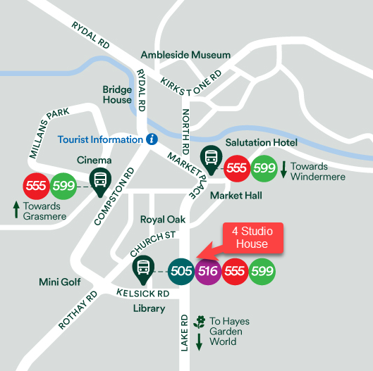 All buses to Ambleside stop opposite the library on Kelsick Road. This is a 3-5 minute walk to Studio House.
